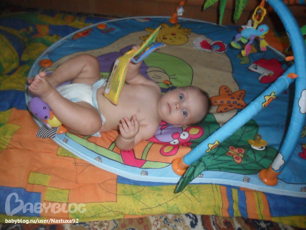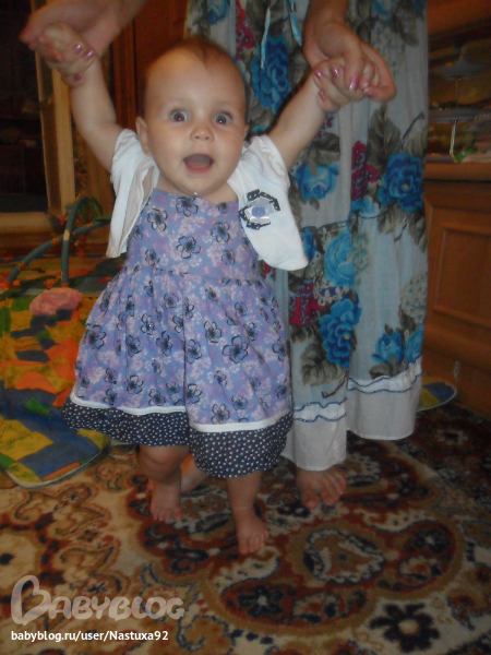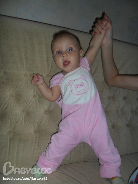 Мы очень быстро перекатываемся куда хотим, ползаем как гусенички, сидим, кушаем овощи по немножку, по 10 мин в день носимся на ходунках, обожаем ходить за ручки. И фотки):