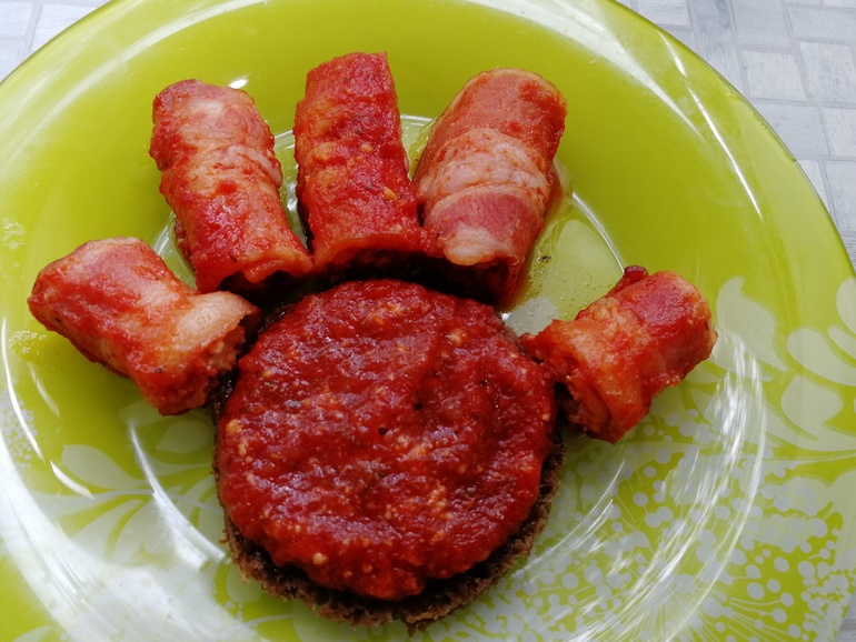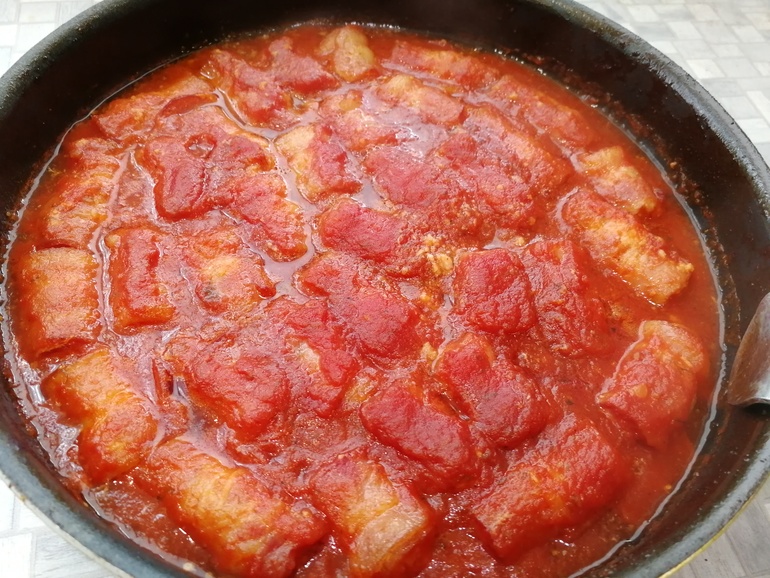Я использую свою заготовку: протертые томаты без кожуры с добавлением яблочного пюре, печеного перца и лука, чеснока, соли, паприки. Просто провариваю вместе и закатываю. Конечно, можно использовать любимый кетчуп или разведенную томатную пасту с добавлением трав, соли и сахара с паприкой.