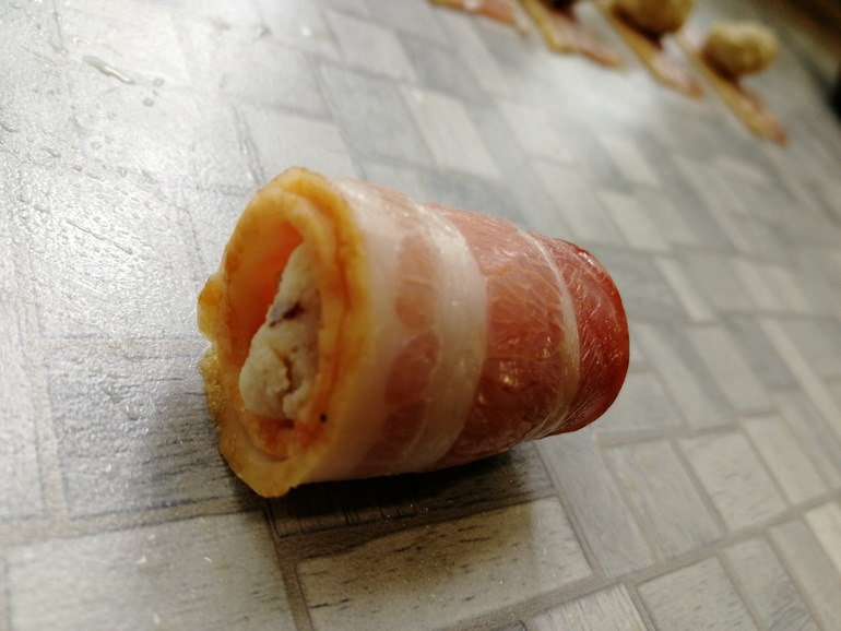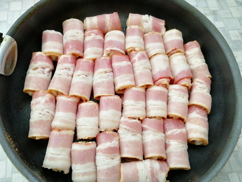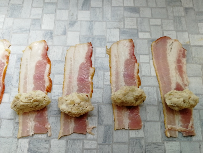 На полоску бекона выложить 1 ч.л. фарша: