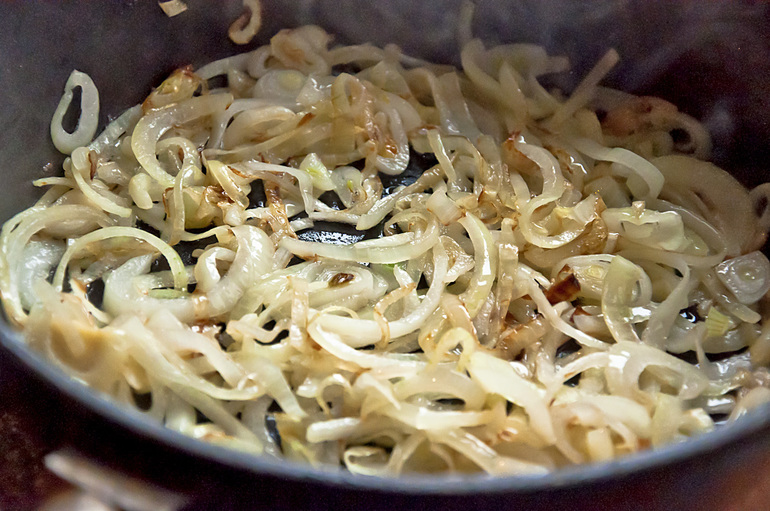 Остудить в бульоне. Снять мясо с костей. На растительном масле спассеровать лук: