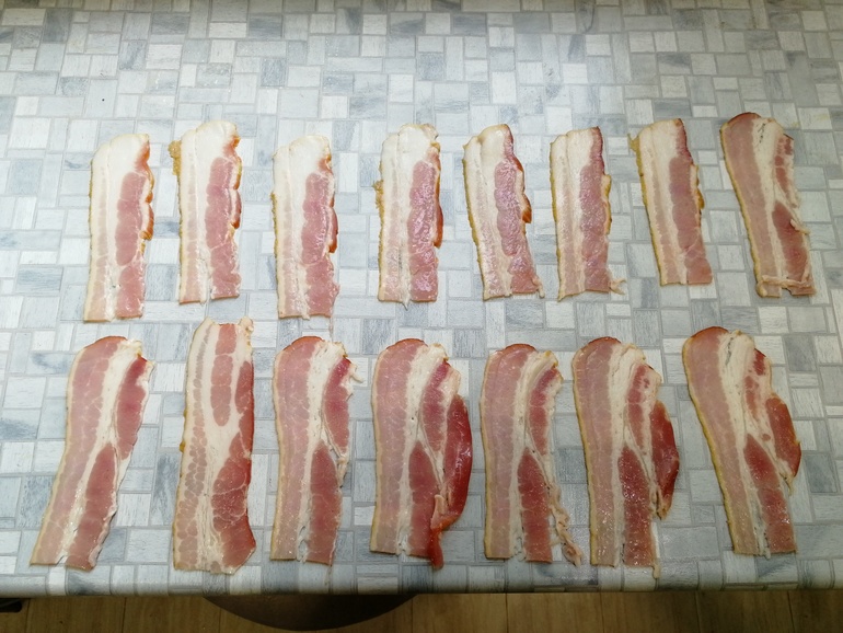 Полоски сыровяленного бекона разрезать пополам: