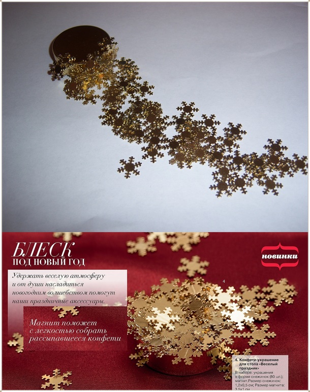 В наборе: украшения в виде золотистых металлических снежинок и круглый золотистый магнит поможет с легкостью собрать рассыпавшиеся конфетти. Размер снежинок: 1,2 х 0,5 см. Размер магнита: 3,5 х 1 см.