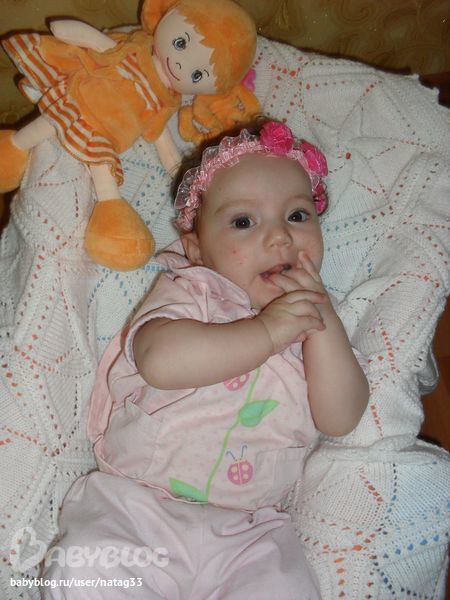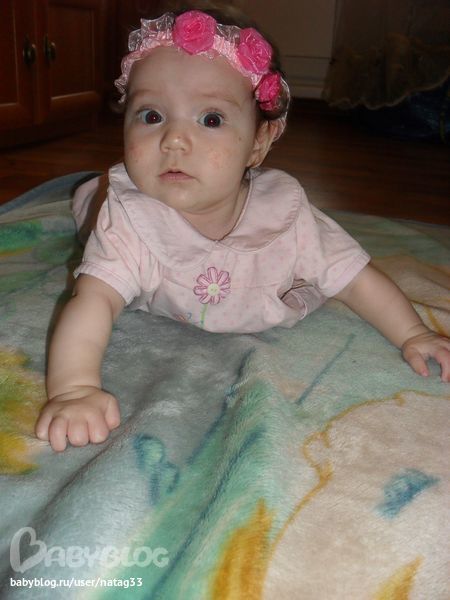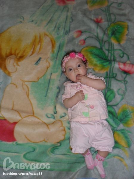 В этом месяце научились многому, смеятся, визжать, петь на распев, переворачиваться со спины на живот, хватать и держать игрушки, правда место им всем в нашем маленьком ротике, как впрочем и кулачкам. Зубов пока не намечается, хотя слюней реки и нервничаем когда грызем прорезыватели. В рот тянет все, что дают в руку и что схватила сама. Буквально дней 5 назад стала сосредоточенно пытаться схватить игрушку на развивающем коврике, дергает за нее и довольная слушает мелодию, с утра может так долго пролежать, это единственное время когда она долго лежит на спине. В остальное время днем сразу переворачивается на живот, даже в шезлонге выгибается - пытается перевернуться. На пеленальном комоде удержать невозможно, подгузники одеваем с улюлюканьем, чтобы хоть на минутку задержать ее в положении на спине. Очень любим купаться, начала брыляться в ванночке, брызги во все стороны, пытались освоить большую ванну, но пока нет круга стоять в наклонку тяжело, и так болит поясница. Перешли на 3-х разовый дневной сон, время сна стало удлиняться от 1 часа до 2-2,5. Бодрствуем 1,5-2 часа ,бывает даже и 2,5-3, но это очень редко. Спать укладываемся в 22-22,30, ТОЛЬКО с укачиванием и чтобы титя была во рту, никакие другие варианты не прокатывают, больше ребенок плачет и дольше потом успокаиваю. Встаем в 9,30, реже в 8,30. Уже как 2 ночи не пеленаю, решила попробовать пока ТТТ все нормально, конечно ночью слышно чмоканье (пальцы во рту), но зато сразу просыпаюсь и заменяю на титю, молока теперь днем завались. Кормимся тоже где-то раз в 1,5-2-2,5 часа, на сон сосем, если спим дома, то и во время сна (лежу с ней) и после прогулки (получается после сна). Гуляем 1-2 раза, по времени как повезет, в смысле сколько спит столько и гуляем, от 40 минут до 3 часов. Бывает на прогулке задерживаемся, рассматриваем деревья и дворовую ребятню. Всем улыбается без разбору, на руки тоже идет ко всем, вступает в свой малышковый разговор, наверно на мамку жалуется