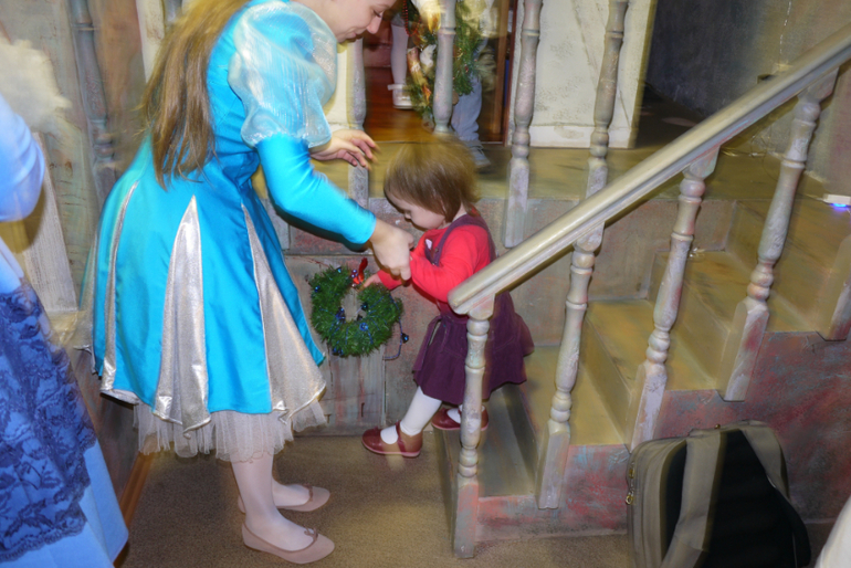 И попали мы вот в такую комнату, там тоже надо было очистить от снега комнату и станцевать танец, чтобы пришла Снегурочка. Мирославочке, очень понравилось танцевать, но вот Снегурочку Мирочка застеснялась. Мирка так хотела Снегурочке рассказать как ее зовут, но только подходила, как тут же убегала от Снегурки.