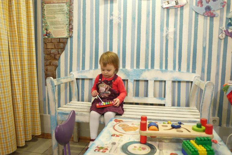 Искали мы этот театр долго, благо что приехали заранее. Когда в него зашли, у меня почему-то сразу всплыли ассоциации с детским садиком. Заходит в входную дверь,а там сразу раздевалка и небольшая толпа родителей с детьми, все переодеваются. Мы тоже переоделись, переобулись и пошли в комнатку ждать представления.
