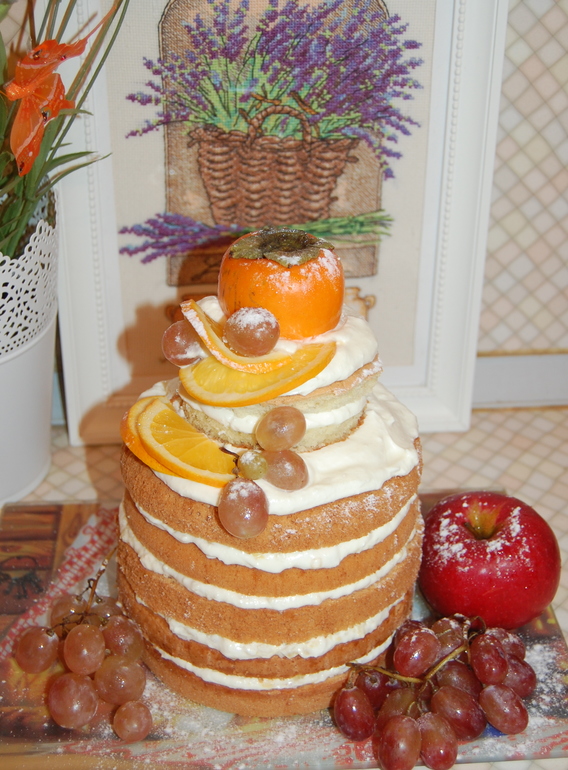 Быстро, вкусно, красиво. Коржи бисквит, крем сливочно -творожный с персиками, украшение - любые фрукты.