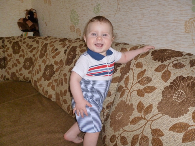 -встает у любой опоры, передвигается вдоль, если захотел сесть,то опускается очень аккуратно, приседая вытягивает руку и садится на попу,а ещё очень любит прыгать,держась за кроватку или за кого-то)