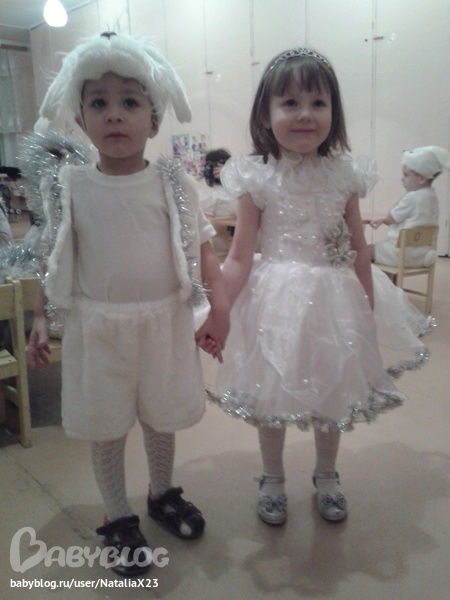 Сегодня в садике был утренник,мне очень всё понравилось,не ожидала от своего ребёнка,сначала капризнячала сказала снежинкой не буду(по сценарию все девочки снежинки с короной,а мальчики зайчики),а потом когда всех деток увидела одела,хотя мы ничего не усели отрепетировать,но она отлично всё повторяла за детьми и песни вместе пела,стихи мы учили,так она конечно рассказала,танцевала в паре с мальчиком,так даже вела в танце,такая молодец.Она у меня такая активная,шустрая,всё схватывает на лету,не то что я была маленькая.И ёлка ей очень понравилась,воспитательница больше всего боялась,что дети испугаются деда мороза,предупреждала,чтобы они не испугались,а детки и не испугались,наооборот всё было