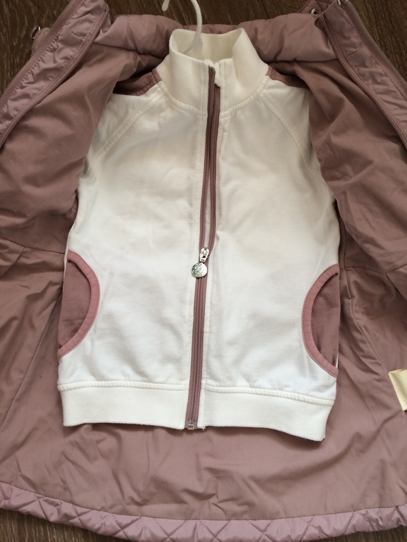 Подкладка - тоненький мягкий трикотаж, если отстегнуть, то получится очень милая олимпийка на замочке. В рукавах вязанная защита от холода, купюшон съемный. Девочка в нем смотрится как куколка!