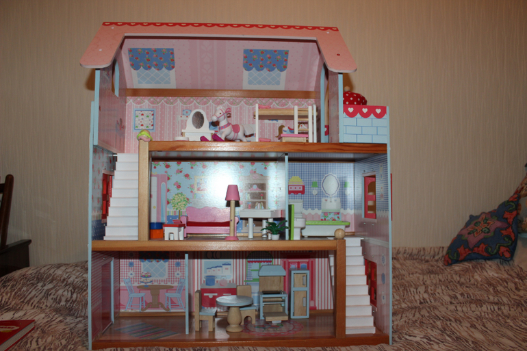 Кукольный дом состоит из нескольких этажей и включает в себя набор очаровательной кукольной мебели. В доме открываются и закрываются окна, а на крыше есть узор из сердечек. В доме нет передней панели, поэтому он открыт к просмотру со всех сторон, что облегчает игру с куклами.