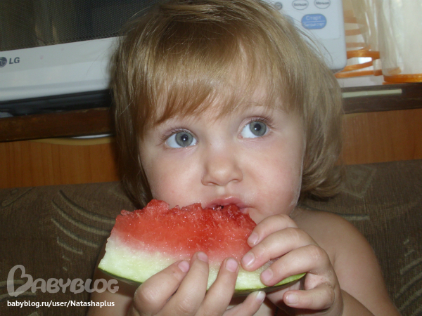 Кушает плохо всего два раза в день, больше перекусы фруктами,все больше удивляют ее вскусовые предпочтения.Любит арбузы не любит дыню прям нос воротит,понравилась ежевика, смородина нет,кукурузу вареную точит за обе щеки, малину только вареньем,персик нет, абрикос нет, зато косточки от абрикосо да.