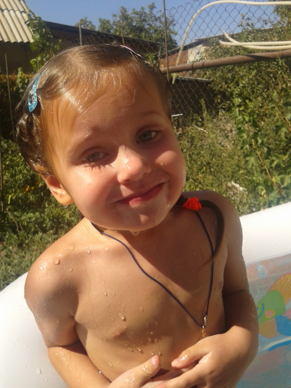 Много времени проводит в бассейне у нас сейчас очень жарко +40 , она уже такая загоревшая толька попа белая))))Научилась нарять с головой и задерживать дыхание под водой теперь оттачивает мастерство.Все так же зависит от мультиков,но тут или ее надо занимать или включить мультик.