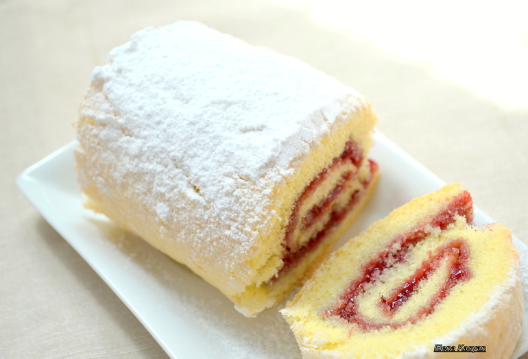 смешиваем все сухие ингридиенты,добавляем яйца и взбиваем.застелить противень,пекарской бумагой.смазываем ее маслом. выливаем тесто и аккуратно распределяем его по бумаге.выпекаем 6 минут при температуре 180гр.Горячий корж смазываем джемом(если он имеет густую консистенцию,то лучше заранее разогреть) и сварачиваем в рулет.У меня был с вишневым джемом,он был с легкой кислинкой,поэтому сочетание со сладким бисквитом было отличное,не приторно сладкое.Украшаем сахарной пудрой!вот так все быстро и просто