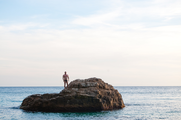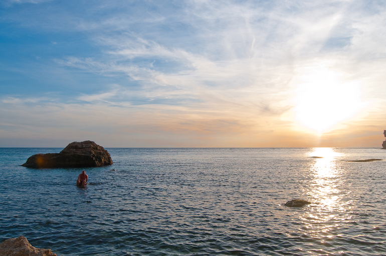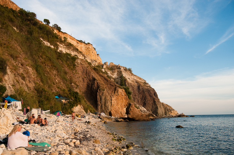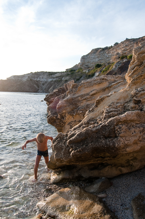 Мы начали спуск. Метров через 10 я вопила, что дальше не пойду. Но меня никто не послушал . В середине пути встретили несколько диких стоянок хиповатых личностей. Первые жиле в пещерах внутри горы, похожих на кельи. Вдоль обрыва бегали голопопые годовалые дети. Чуть ниже среди деревьев стояли еще палатки. Еще ниже из скалы бьет родник с очень вкусной водой. На пляже тоже полно палаток. Но мне было ооочень страшно идти. Я еще к тому же была в юбке, тропа постоянно сыпалась из-под ног. Дошла до пляжа в холодном поту, мне было страшнее, чем прыгать с парашютом. Наверное это с непривычки. Очень хотелось купаться. Дно там каменистое, вода чистейшая. Заходить в воду тяжело, сложно удержать равновесие, так что от берега прям было удобнее отплывать. А внизу камни покрытые какими-то жесткими. не скользкими и даже приятными водорослями.