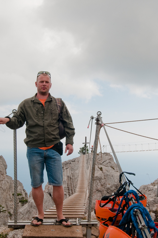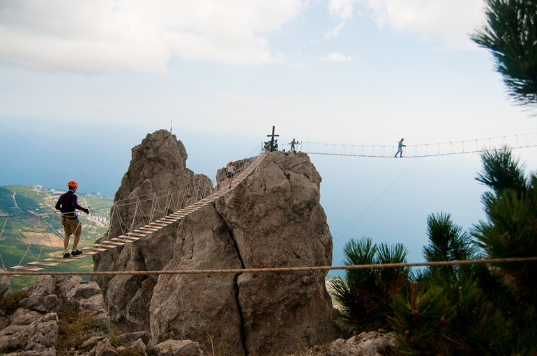 Не вершине есть два развлечения. Одно - что-то типа электрической тарзанки. Второе - веревочный мостик между зубцами.