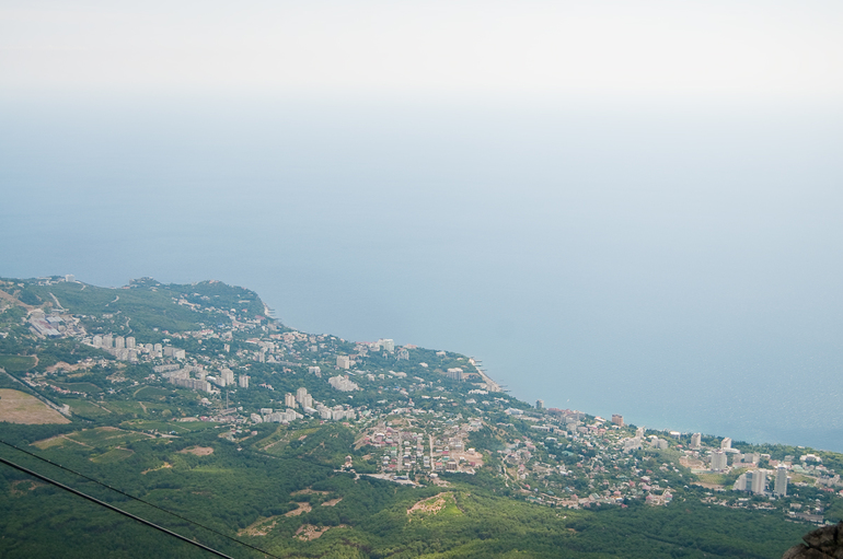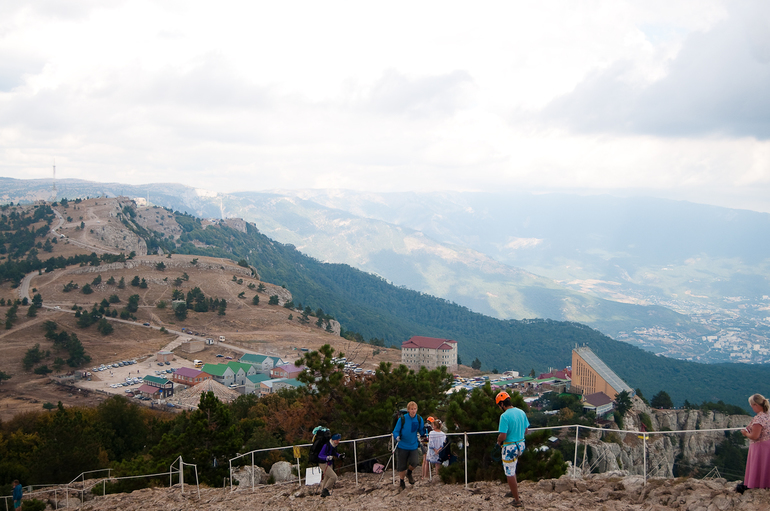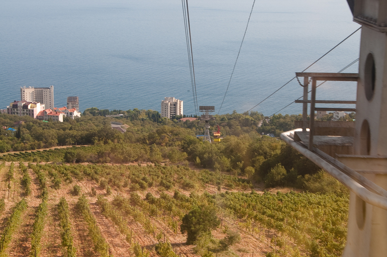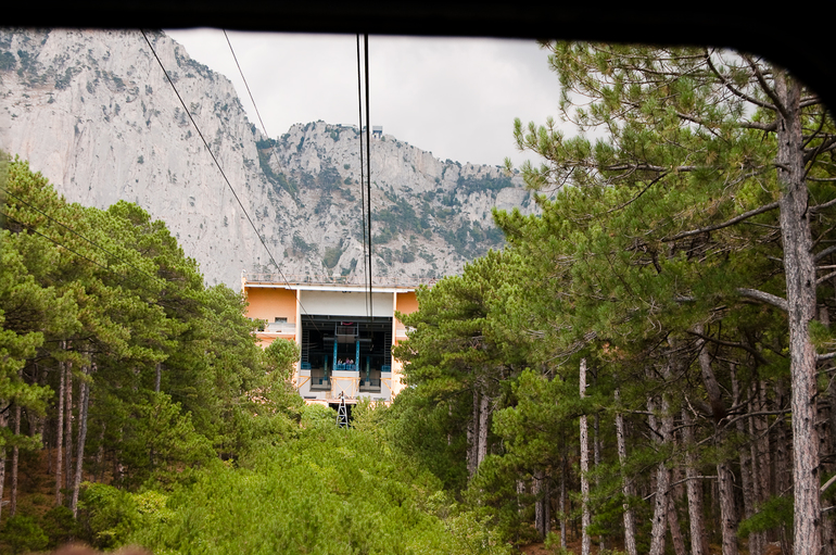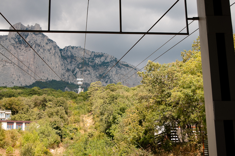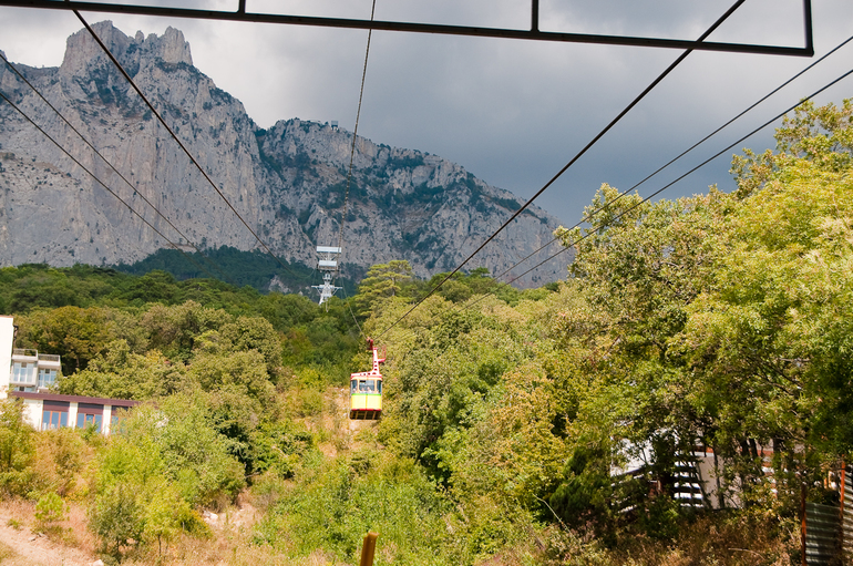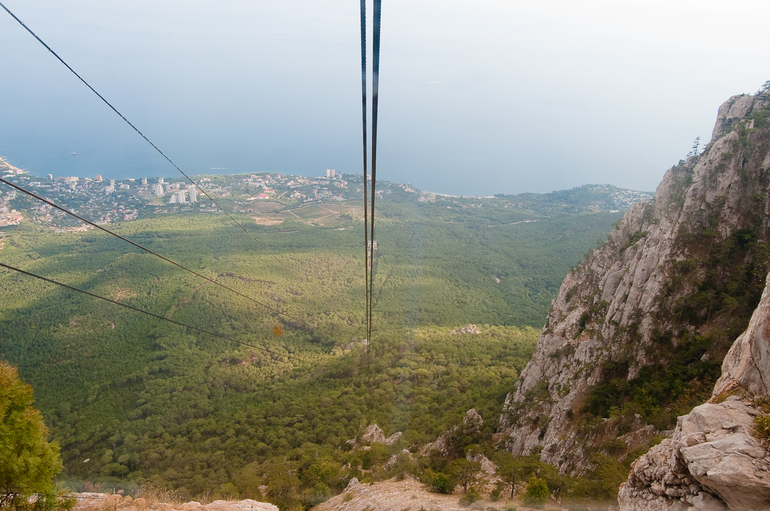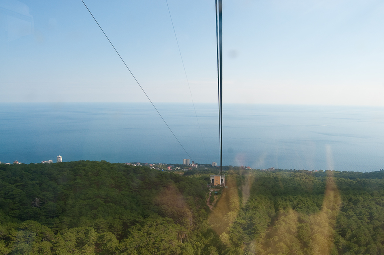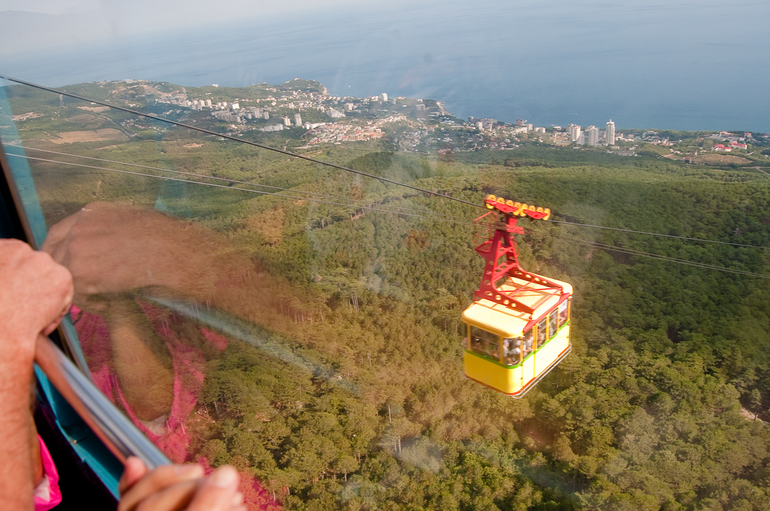 Приехали в Мисхор, где начинается большая канатная дорога. Летом там многочасовые очереди в кассу. Наперебой кричат водители микроавтобусов, предлагая без очереди подняться по серпантину. Мы стояли где-то около часа, может чуть меньше.
