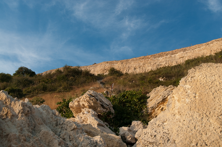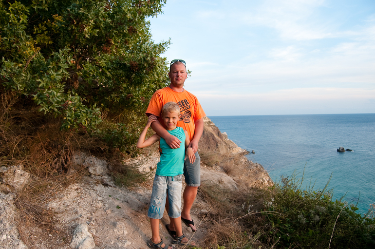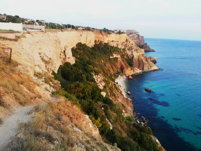 приезжаем куда-то в район небольшого мыса Виноградный. там коттеджный поселок. Спрашиваем у молодого человека, где можно спуститься к пляжу. Он отвечает, что здесь и машет в сторону моря. Приходим и оказываемся на краю огромной скалистой горы,а море где-то там далеко внизу. К море ведет узенька и , как оказалось, очень сыпучая трапа.