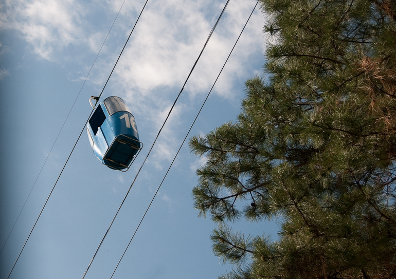 На вершины нужно подниматься с пересадкой из одного вагончика в другой. Второй отрезок пути более крутой и в конце ты как бы зависаешь на скале.