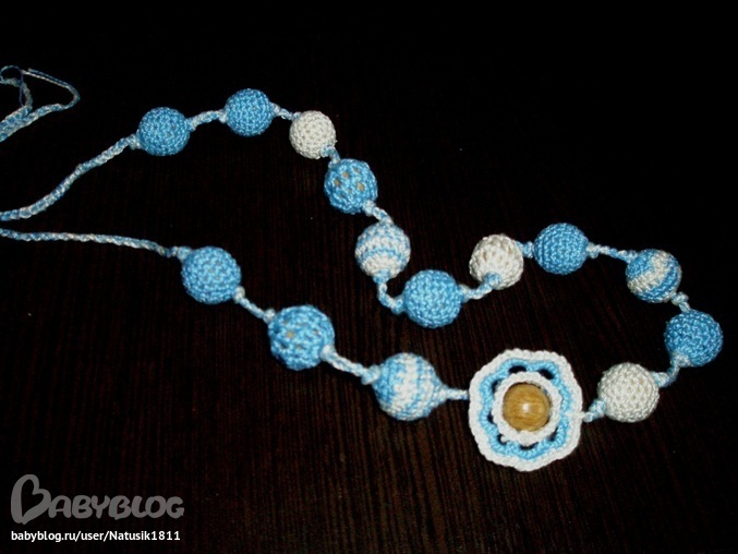 я к нему уже бусики сплела)), не судите строго, это дебют, хочу еще слингоигрушки связать, только еще не придумала какие...