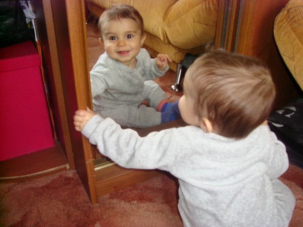 играется с мальчиком в зеркале