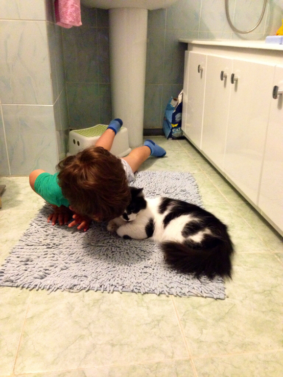 Нежности с кисей. Перестал ее обижать и бить, только гладит и целует. Но кися все равно еще по привычке шипит на него.
