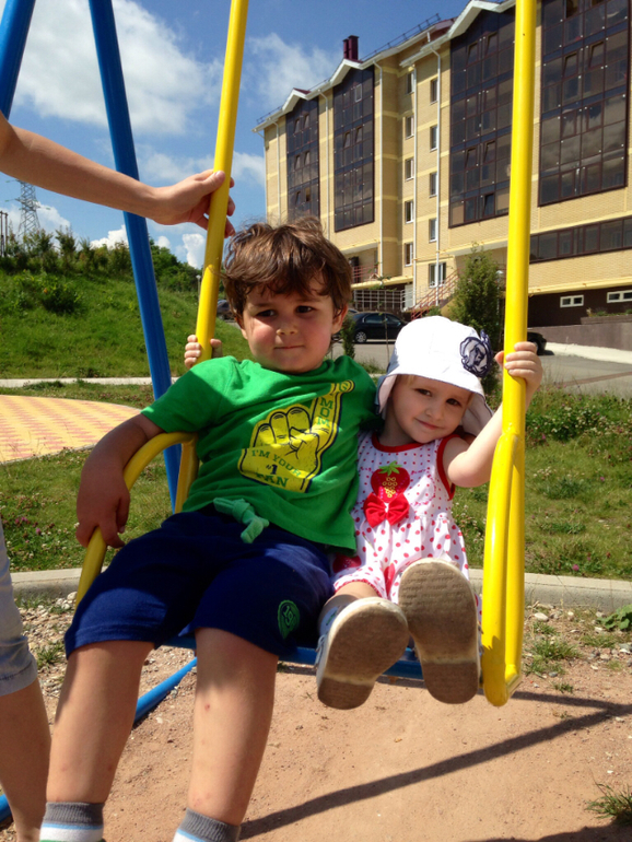 С Аленкой) за время нашего отсутствия нам поставили детскую площадку, хоть какую-то, есть где покачаться теперь)