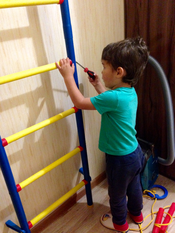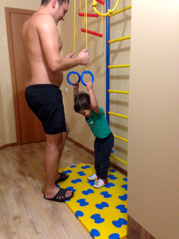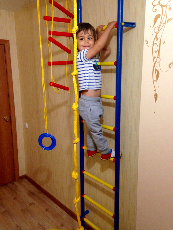 Как и любой мальчик, Тема любит играть в мяч, бегать, прыгать, лазить по лестнице. Поэтому на эту полукруглую дату подарили мы сыну спорт.комплекс, небольшой домашний. Установили на выходных, пока еще лазиет под папиным наблюдением.