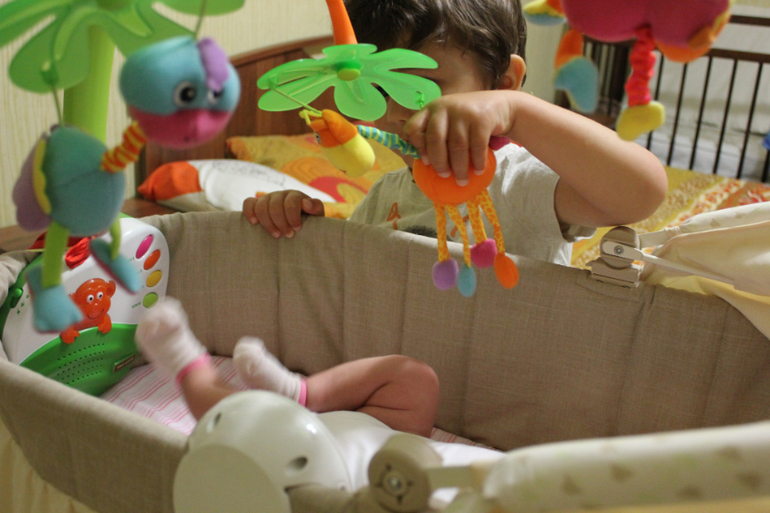 Радует меня своим поведением) Очень ласковый и со мной, и с сестричкой! Старается участвовать во всех играх с Ксюшей) когда Ксюша бодрствует, он всегда рядом: погремушкой потрещит, в коврике с ней полежит, даже мобиль помогает крутить, когда Ксю на него смотрит) Вообще на всех этих малышовских игрушках 0m+ надо писать 24m+)))