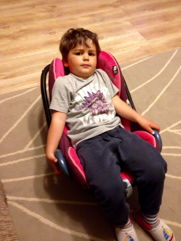 Влез в Ксюшино автокресло. Он бы еще на качелях с радостью покачался))