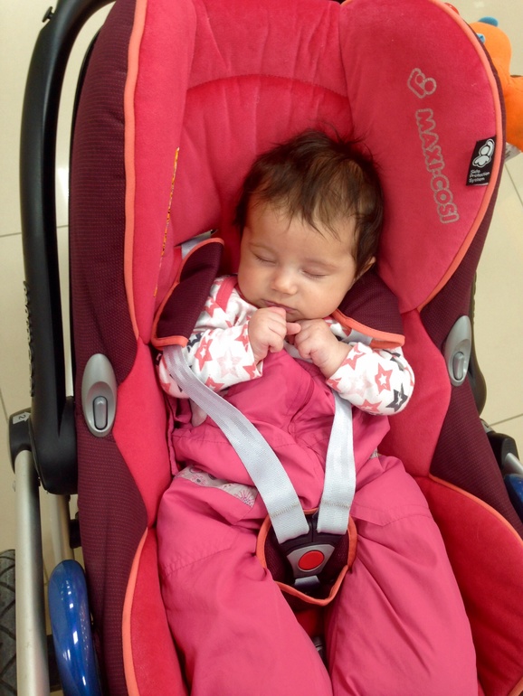 Ксюша уже не первый раз в ТЦ, ведет себя обычно хорошо, плачет редко. В этот раз спокойно лежала а автолюльке, посасывала кулачки и уснула)) проспала все время, что мы ходили по магазинам, мы даже пообедать успели) а Тёмку оставили дома с бабушкой
