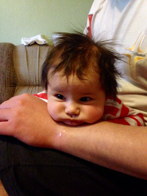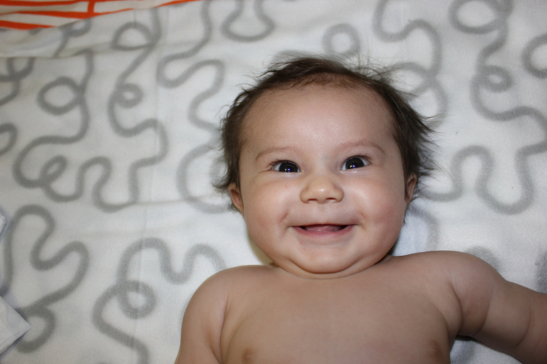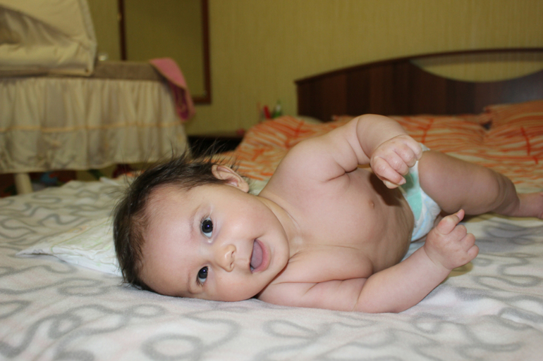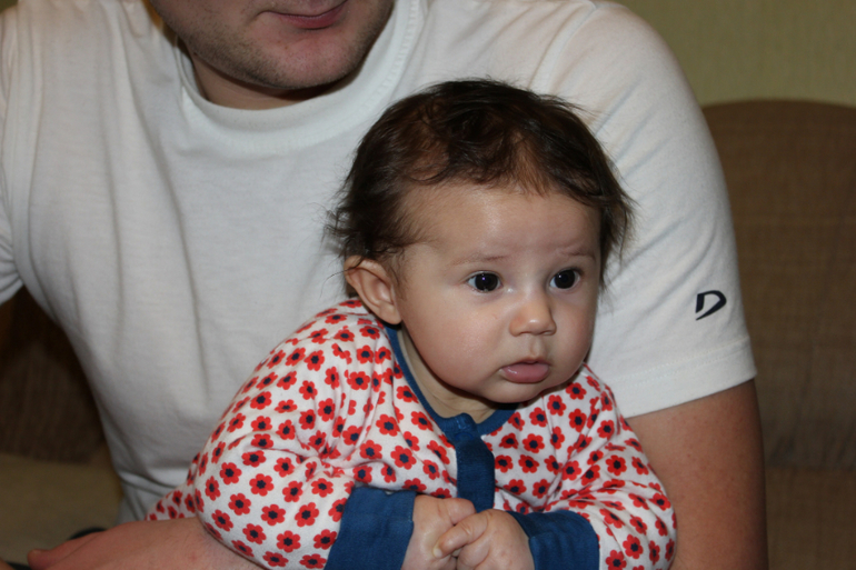 - оценила папины подкидывания, улыбается во весь свой беззубый рот от восторга