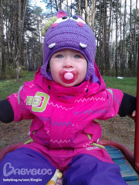 Утягивала, но не сильно, а то она показывала, что ей не удобно. Там больше видно, что велик После талии-попа висит в районе коленок.))) Ну будем носить не один год судя повсему :) Шапка у нас вообще чУдная-бегемотик, мы на заказ вязали под комбинезон. Мне бы очень хотель посмотреть какие шапки носят дети под эти комбезы, кроме однотонного шлема мне больше ничего не думалось, а тут увидела такой вариант!.)