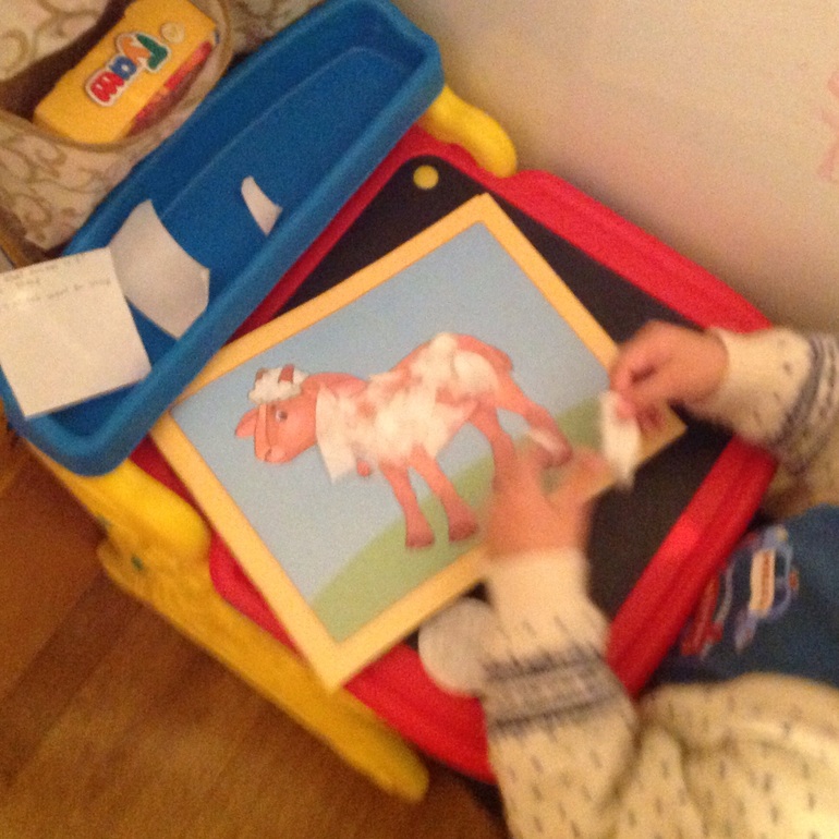 Аппликация ватой - овечка. У меня ребенок пытался узнать, зачем шерсть ягненку, он что мерзнет. А я не знаю как объяснить на английском, только "ага, ага"