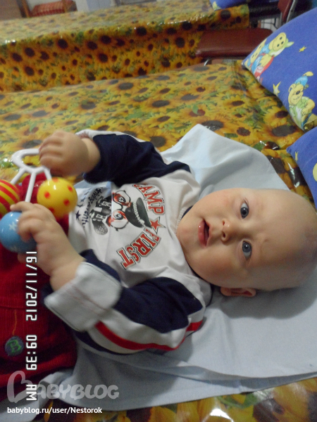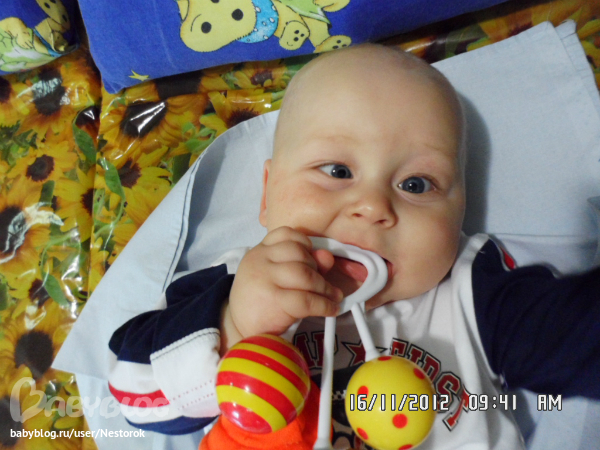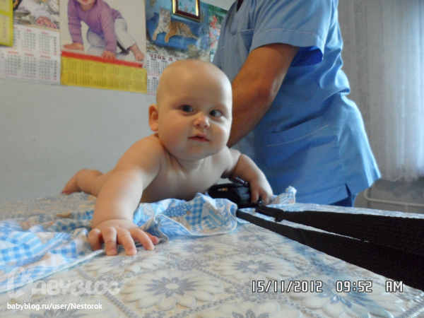 Закончились нраши двухнедельные мучения с физиопроцедурами. Хорошо, что папа был в учебном отпуске и ходил с нами, помогал успокаивать нашего хищника) Невропатолог наша назначила курс массажа, озокеритовые сапожки на ножки, электрофорез (прозерин и никотиновая кислота) на шейный отдел, диагноз ставила синдром тонусных нарушений, натальная травма головы (у нас кефалогематома была, и как следствие - сходящееся косоглазие. на процедурах вели себя мы плохо, особенно на массаже, т.к. все время малой куда-то хотел ползти, выкручиваться, а не давали, так что массаж - это 20 минут ора... ух....еще это все совпало с прорезыванием зубов, 2 нижни есть, лезут 2, или больше, верхних. ночи бессонные, аппетита нет, и настроения, конечно тоже. но отходили с горем пополам, косить, вроде стал меньше, тонус в ножках ушел - на носочках не стоит, пополз после пятого массажа сам, становится на коленки, а если удается подтянуться, то и на ножки. но ненадолго - масса-то большая) зато, как пополз, стал худеть, вместо 300-400 грамм каждую неделю, за 22 дня набрал всего 120! итого весит лёвушка 12 200!