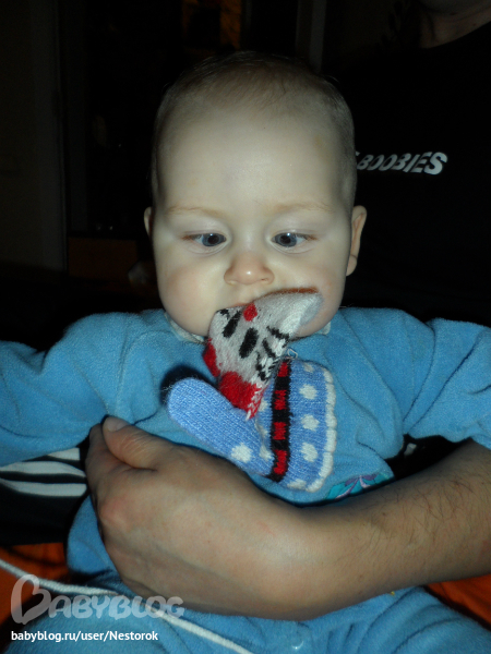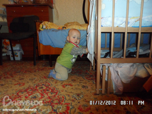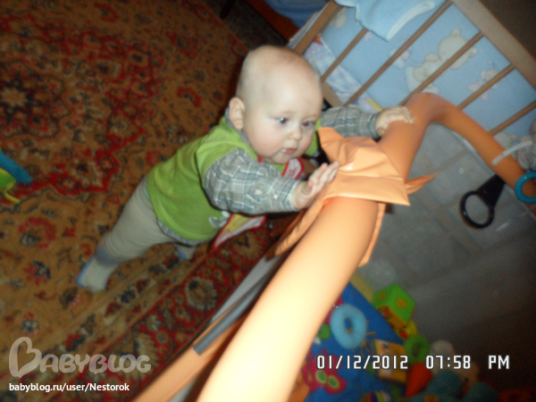 Вообще, гулять с малым стало просто ооочень тяжело, в коляске он едет минут 20 - а потом в крик - и ттолько на руках. А носить его, весящего 12 400, да еще и в зимней одежде.....Думаю, многие поймут меня, почему мы сократили прогулки до минимума. Раньше он еще был непротив покататься на качельке - а теперь стремится опуститься на коленки и ползти куда-то...Это ползанье меня уже вымотало в край - он просто неутомимый, не может и 5 минут с игрушечкой полежать или посидеть: то ползет, то встал, пошел, упал, поплакал, опять ползет - и так весь день без остановки. Что-то с тало и со сном: то ли перевозбуждается он от такого моря впечатлений)), но впервые за все время я не могу его уложить спать. 2 дневных сна по 2 часа канули в Лету, теперь даже на ночь по 2-3 часа укладываемся. Раньше - искупались, под сисю -и все. Теперь уже с закрытыми глазами он все равно куда-то пытается ползти, орет при этом, потом упадет посреди дивана, начинает сопеть, я не трогаю - а вдруг уснет. Но 5-10 секунд храпа - и с закрытыми глазами сквозь сон пополз снова... Оххх! Вчера только с неврохелем заснул (когда-то невропвтолог успокоительное ему выписывала).