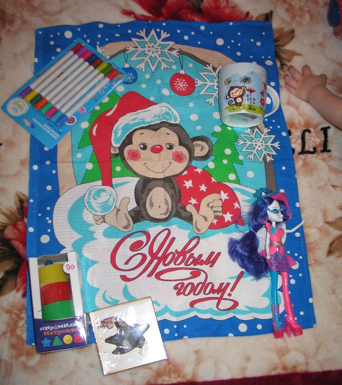 сюда попали (помимо куклы, которая будет много где) 3 яичка шоколадых с символом года, полотенце с обезьянкой, кружка с обезьянкой, двухсторонние фломастеры, растущая елочка, 2 игрушки для Игорюшки: логический кубик (выбран пока он для игры ) и непростая такая пирамидка (не распаковывали)...