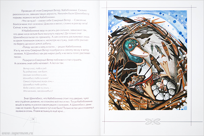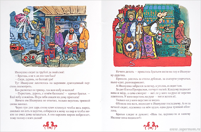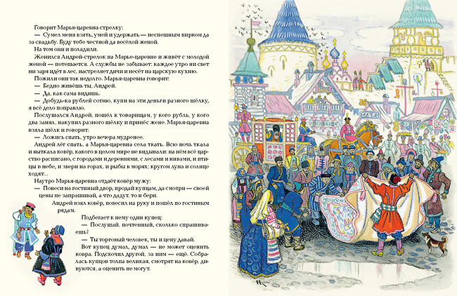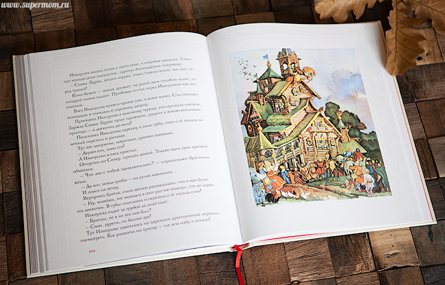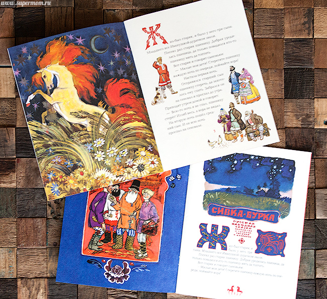 Книга отпеатана на офсете, иллюстрации здесь хоть и яркие, но матовые. Текста в книге много, но иллюстрации почти на каждом развороте: роскошные, аутентичные, детальные. Хочется рассматривать снова и снова, погружаясь в атмосферу сказочной Руси.