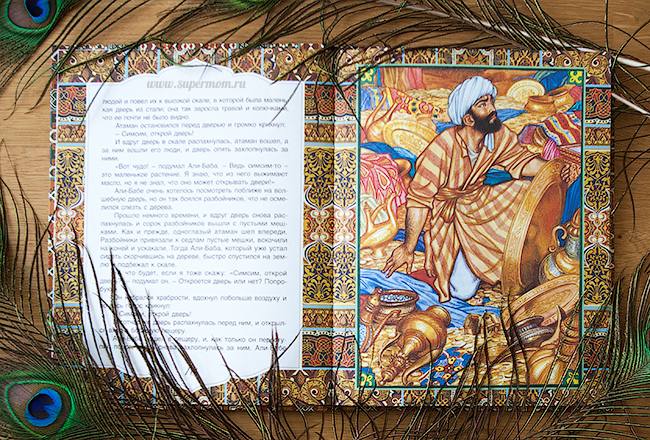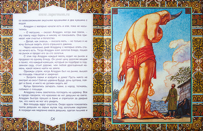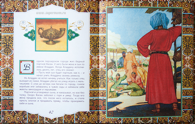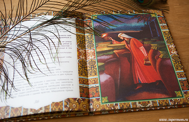 Орнаменты и рамки внутри книги смотрятся очень органично и ни чуть ее не портят. В общем, это хорошее издание известных всем сказок, подойдет и для знакомства с арабской культурой для не слишком впечатлительных дошкольников и младших школьников, и для подарка.
