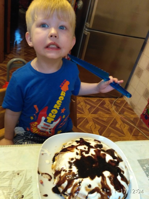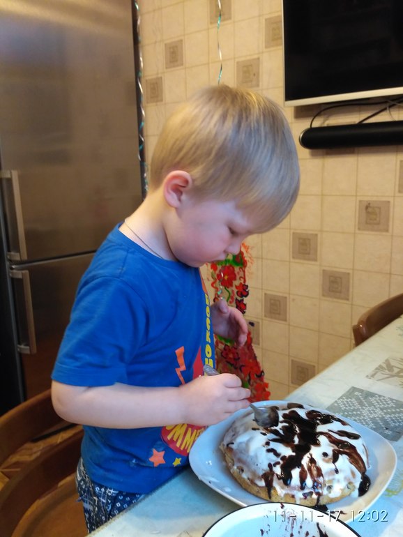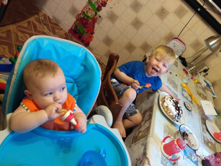 Говорит, что ему осемь лет. Ярослава его старше, восемь больше семи. Такой парадокс. На девять пока не решается.