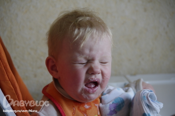 На физиономии прям четко написано: "Мама. что за пакость ты мне суешь, дай лучше молока!"