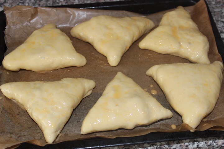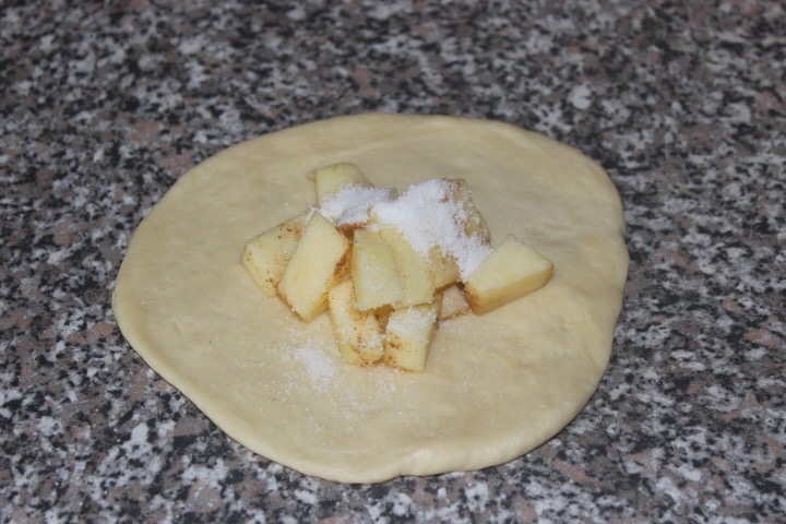 Кладём яблоки посыпанные корицей и добавляем чайную ложку сахара, залепляла я ввиде треугольника и укладывала на противень швом вниз, перед тем как их поставить в духовку, смазываем желтком+немного воды