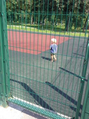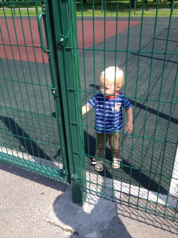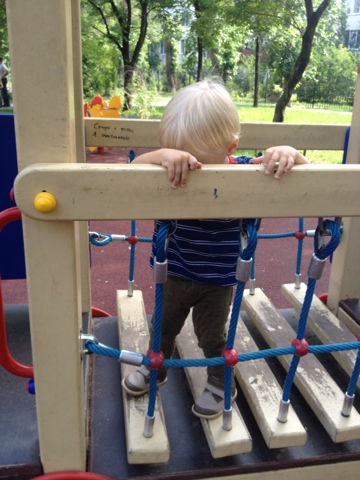 Покоритель какого-то "снаряда". Я даже не знаю как эта штука называется. Но она реально опасная (для малышей, разумеется) - одно неверное движение и какая-нибудь железная труба окажется между ног. Но Андрейка молодец - аккуратно, держась за перила прошел все и не один раз. Смельчак!