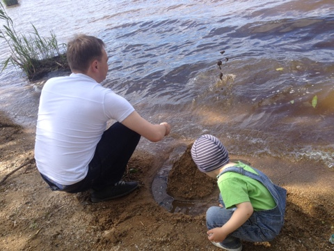 Папа с сыном строили башню и рыли вокруг нее ров, чтобы не напали фашисты.