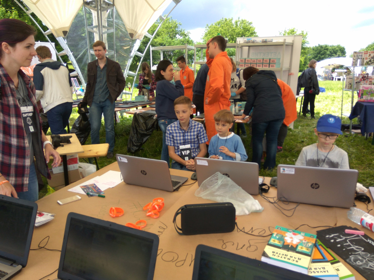 Потом Свят завис в зоне мастер-классов - электроника, конструкторы, программирование :) Договорились, что как надоест - позвонит. И он там протусил три часа :)