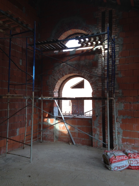 Муж оплатил и поехал проверять наличие работников в нашем домике. Рабочие действительно были - прикручивают сейчас маяки для штукатурки, начали с самого верха: