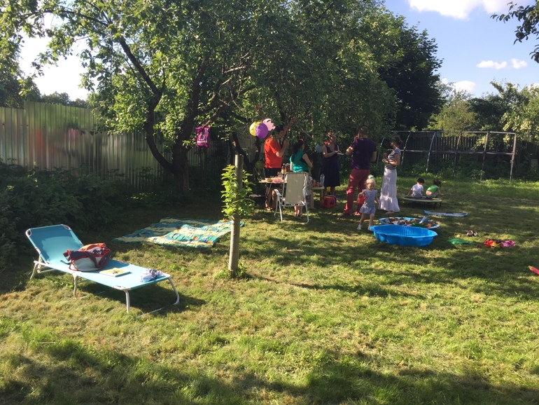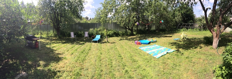 Это был наш первый праздник на природе и не совсем все получилось как задумывалось (даже икру умудрились забыть на кассе в магазине), но в целом, это лучший ДР )) все таки лето и хорошая погода - половина успеха. Большой промах вышел у меня с фото, изначально я даже придумала нам семейный лук - все в бело-синих одеждах разной степени полосатости, но Вася, через 2 минуты, после того, как я его нарядила залез в песочницу, еще через 2 минуты в бассейн... ну а потом было вообще не до фото, в итоге у меня их две - первая просто подготовка нашей поляны: