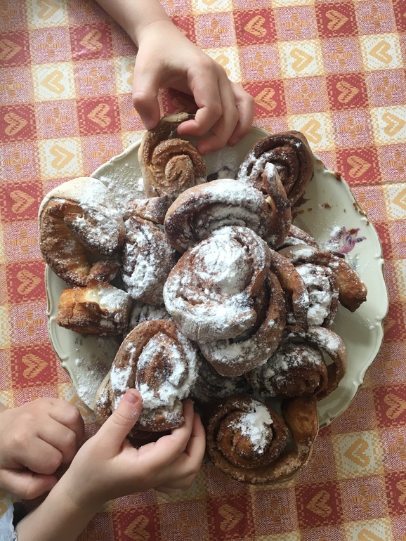 Но на практике, бывает очень по разному! У меня иногда все идет прекрасно и гладко. А иногда...например, как с этими булочками. Вася быс в ударе - просыпал муку, потом сахар, потом пока я на секунду отвернулась включил тостер и сунул туда руку! Промолчу, что Миша в это время пролил молоко. Потом они разобрали половину бабушкиной кухни, засунули в тесто грязные руки.. В общем, когда эти булочки испеклись я выдохнула с облегчением! Рецепт с ББ )