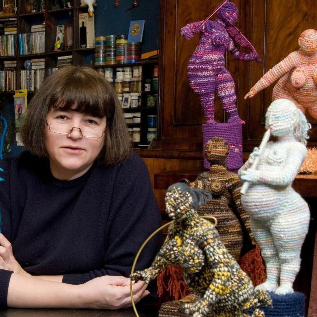 Чей образ ближе всего вязальщице? Конечно же, женский. Именно так решила мастер крючка и спиц Юлия Устинова. Ее вязаные женщины занимаются обычными повседневными делами, а иногда устав от быта, взлетают и парят над землей. Фигурки связаны из разноцветной пряжи (главным образом, шерсть с акрилом). Каждая представляет законченный образ. Есть дамы - мечтательницы и игривые сирены. На создание одной фигуры уходит от нескольких дней до пары месяцев. Наиболее трудоемкая часть работы - фиксация скульптуры на постаменте.