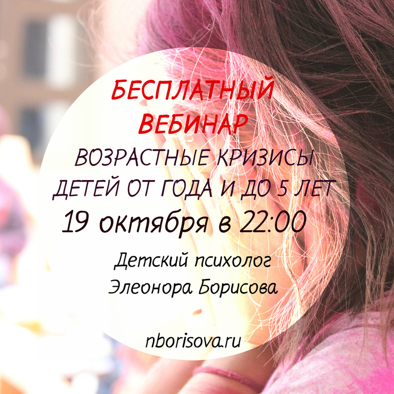Присоединяйтесь к вебинару, что бы узнать про возрастные кризисы детей от года и до 5 лет. На вебинаре вы получите практические советы и рекомендации, как без потерь пережить этот непростой период в вашей жизни.