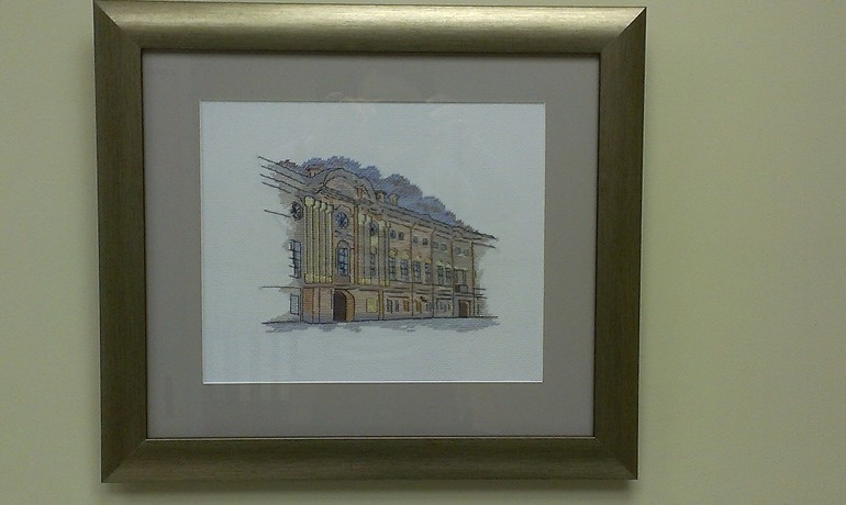 Всем привет. Вышила такую работу в подарок своему начальнику. Здание на вышивке очень похоже на дом, в котором находится наш офис. И надеюсь название "Перспектива" благотворно повлияет на нашу работу.